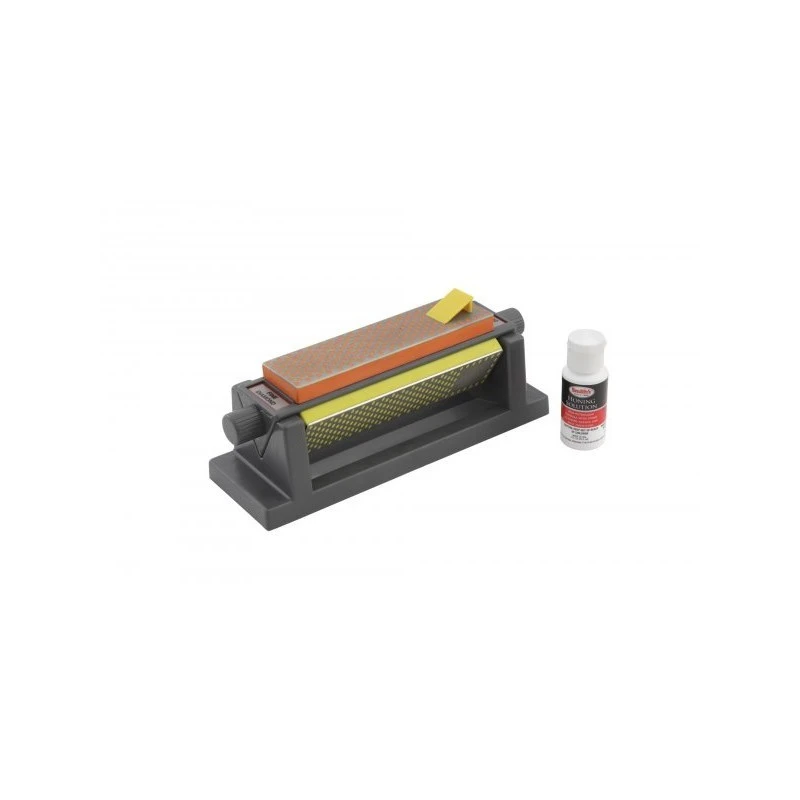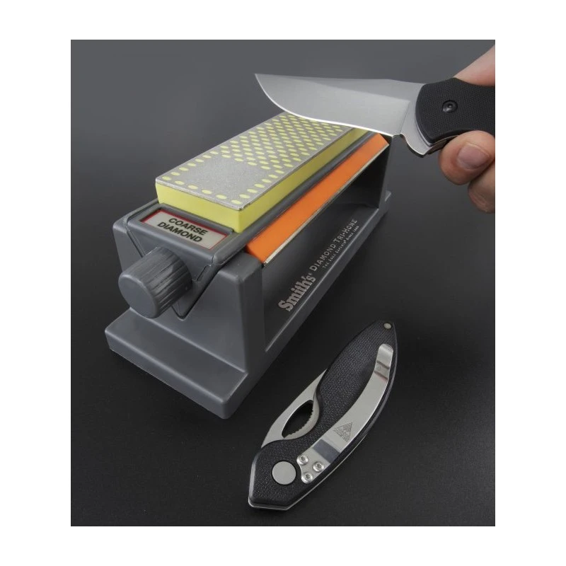 Les 3 Pierres à Aiguiser 15cm Diamant Smith’s permettent d’affûter vos couteaux et outils de 3 façons différentes en une rotation.