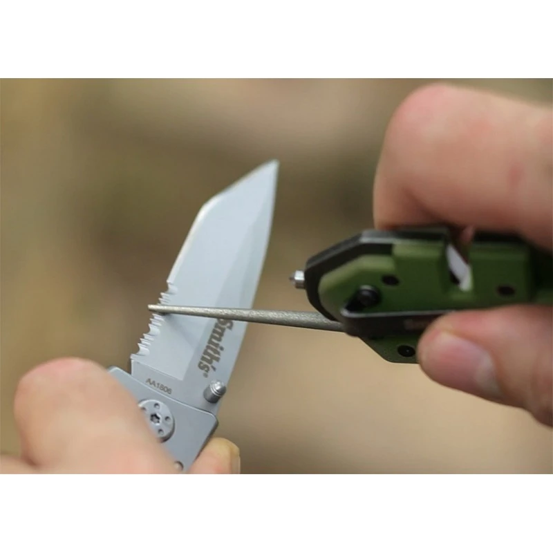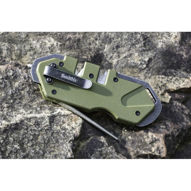 Cet aiguiseur tactique PP1 vert olive de la marque SMITH’S est équipé d’une fente d’affûtage en carbure de tungstène et d’une seconde en céramique.