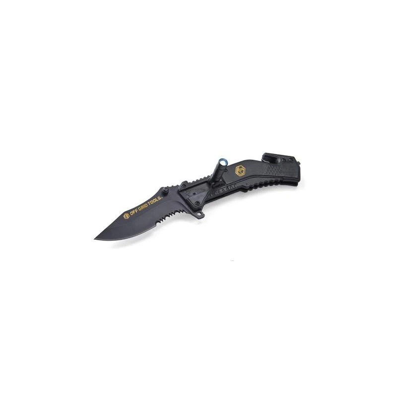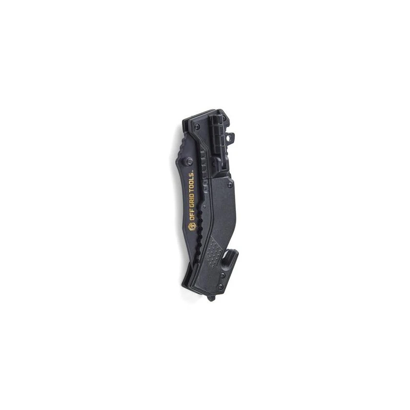 Il possède aussi une lampe de poche à LED réglable, un brise vitre et un coupe corde & sangle.