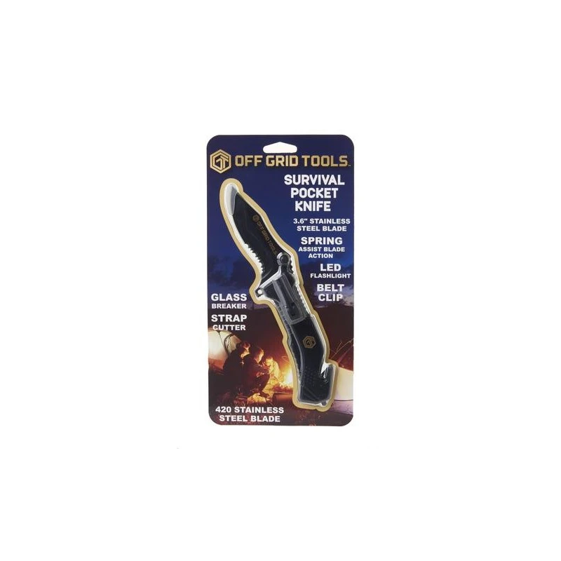 Le couteau de survie de la marque Off Grid Tools bénéficie d’une lame semi dentelée en acier inoxydable.