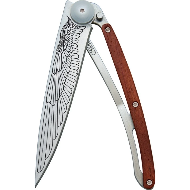 Voici le Couteau Deejo Tattoo Aile qui possède un manche en bois de rose.