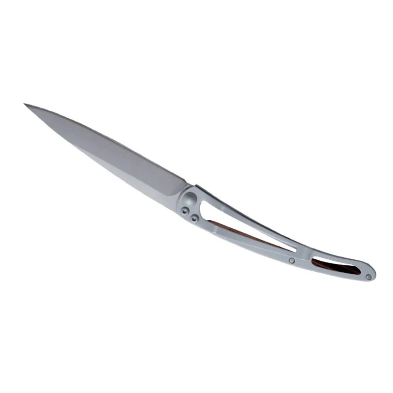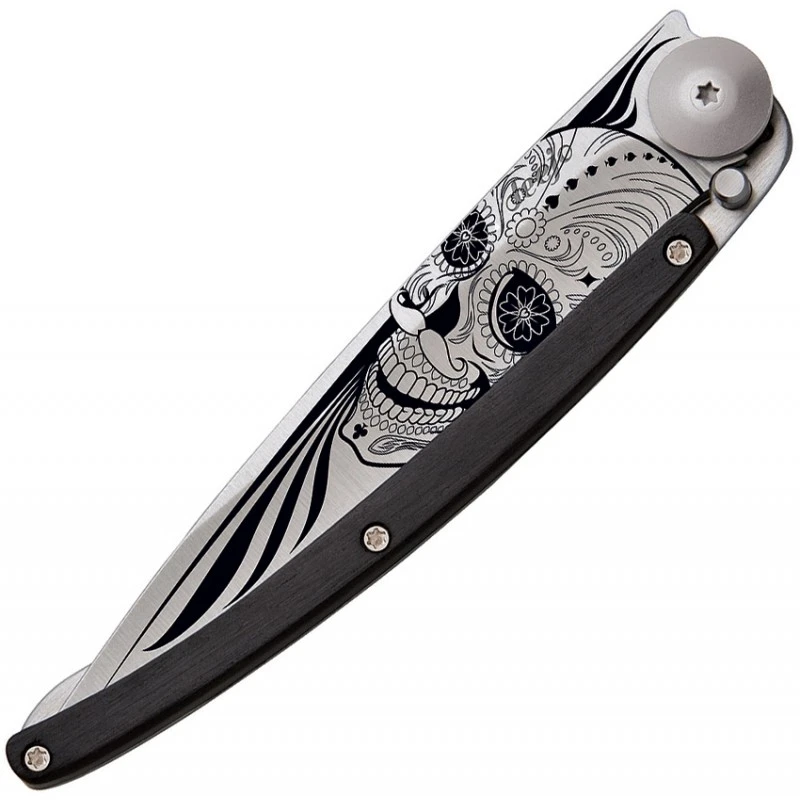 Voici le Couteau Deejo Tattoo Crâne Latino qui possède un manche en bois de grenadille.