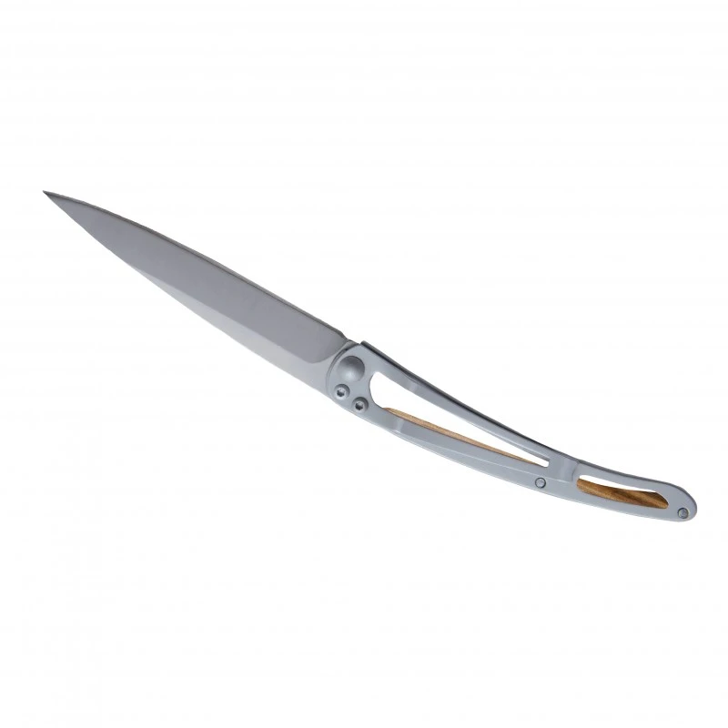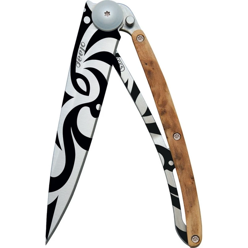 Voici le Couteau Deejo Tattoo Tribal qui possède un manche en bois de genévrier.