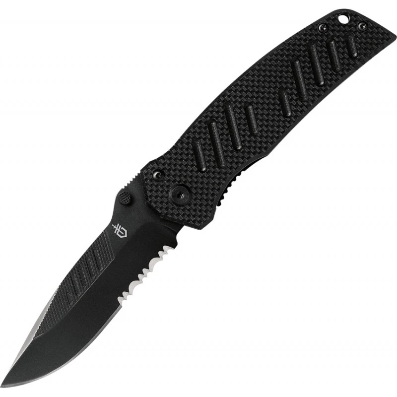 Ce Couteau Swagger GERBER contient une lame Drop Point semi dentelée de 8cm et un manche G-10 en acier inoxydable.