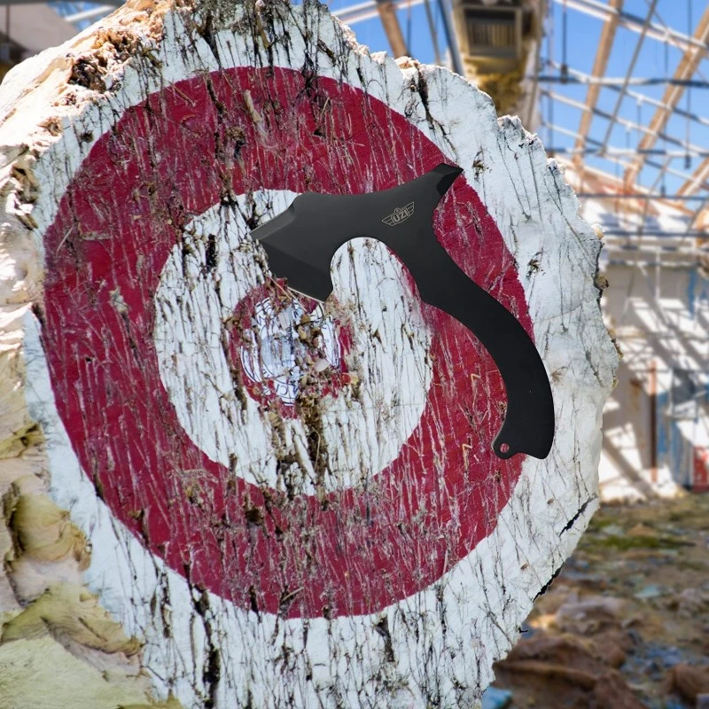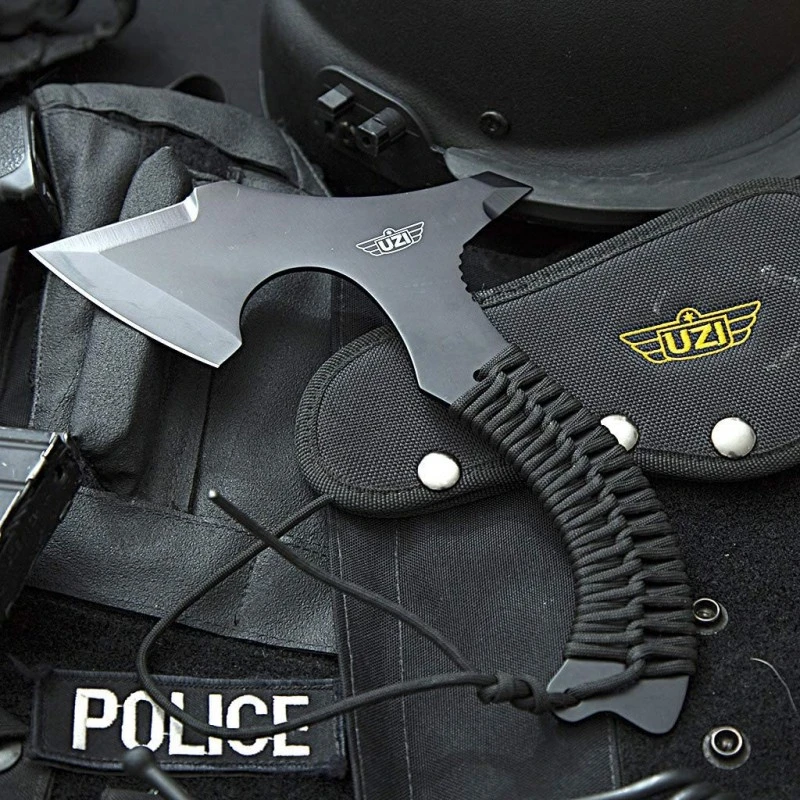 La hachette à lancer UZI dispose d’un double tranchant et d’une poignée en paracorde.