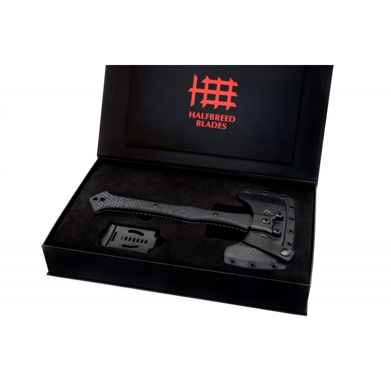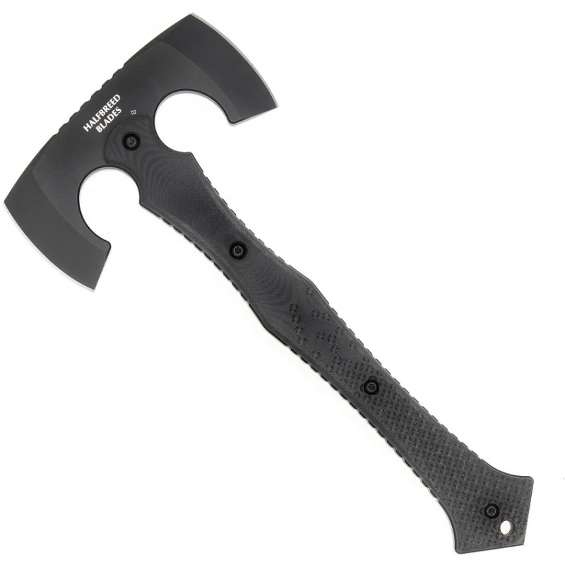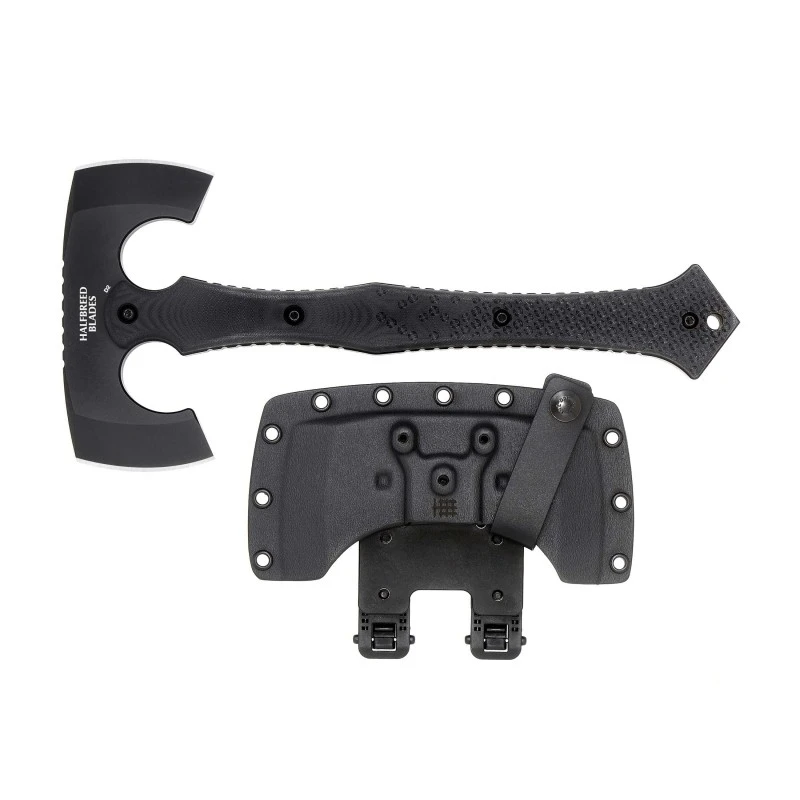 Avec une longueur total de 32cm, cette Hache Compact Battle est conçu avec une tête de 15.2cm en acier K110 revêtue de Téflon noir avec un tranchant de 7.6cm et un manche en G10 (fibre de verre).