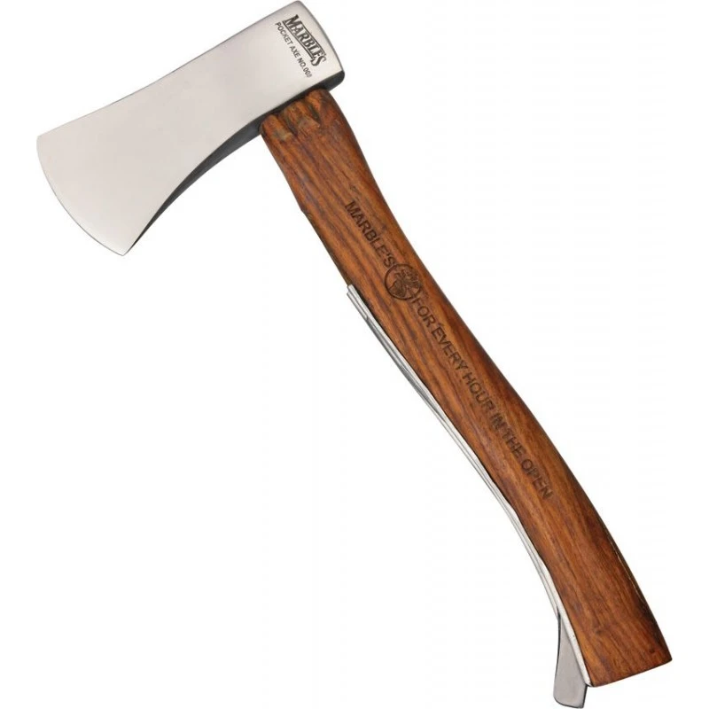 Avec une longueur totale de 27.6cm, la Hache Safety MR5 MARBLES possède une tête en acier Damas ainsi qu’un manche en bois gravé.