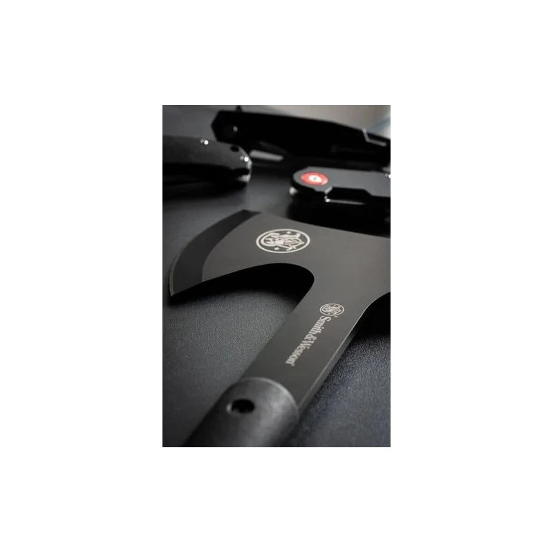 La hache tactique Bullseye M&P de Smith & Wesson est fabriquée en acier noir oxydé à haute teneur en carbone.