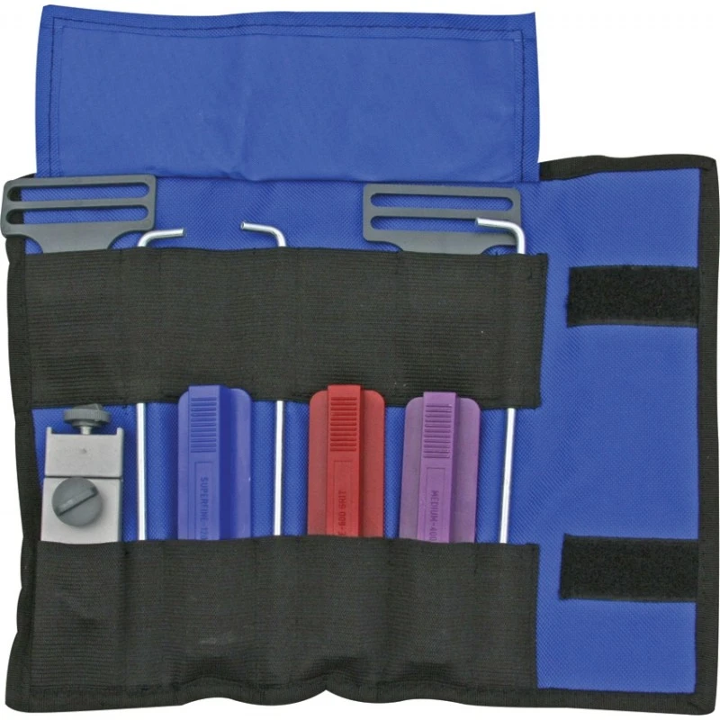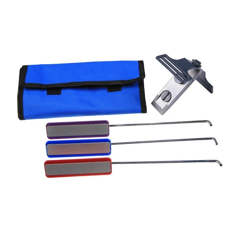 Ce kit de la marque EZE LAP est composé de 3 pierres d’affûtage (grain 1200, 600 et 400), d’une pince à couteau, de guides d’angle, de tiges de guidage et de pochette à rouleau.