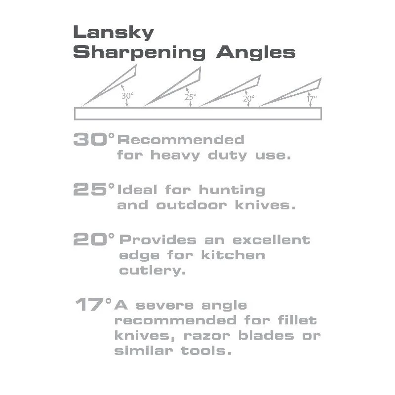 Le système d’affûtage breveté de Lansky vous permet d’affûter vos lames selon 4 angles différents: 17, 20, 25 et 30 degrés.