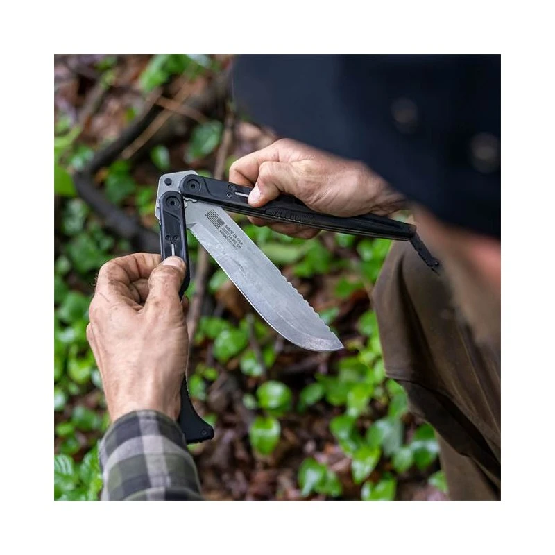 La machette Doubledown de la marque Gerber est singulière avec son ouverture papillon. Équipée d’une lame recourbée noire en acier inoxydable HC 420.