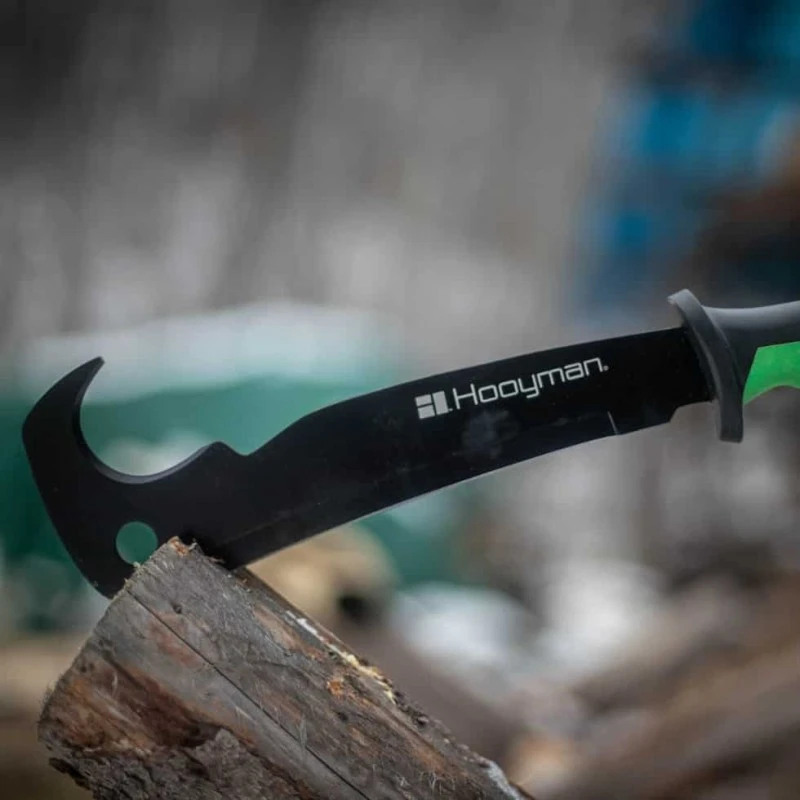 D’une longueur total de 43.2cm, cette Machette Hook Em HOOYMAN offre une lame guthook de 27.9cm conçu en acier inoxydable 3Cr13 revêtue d’oxyde noir ainsi qu’un manche synthétique rainuré noir et vert.