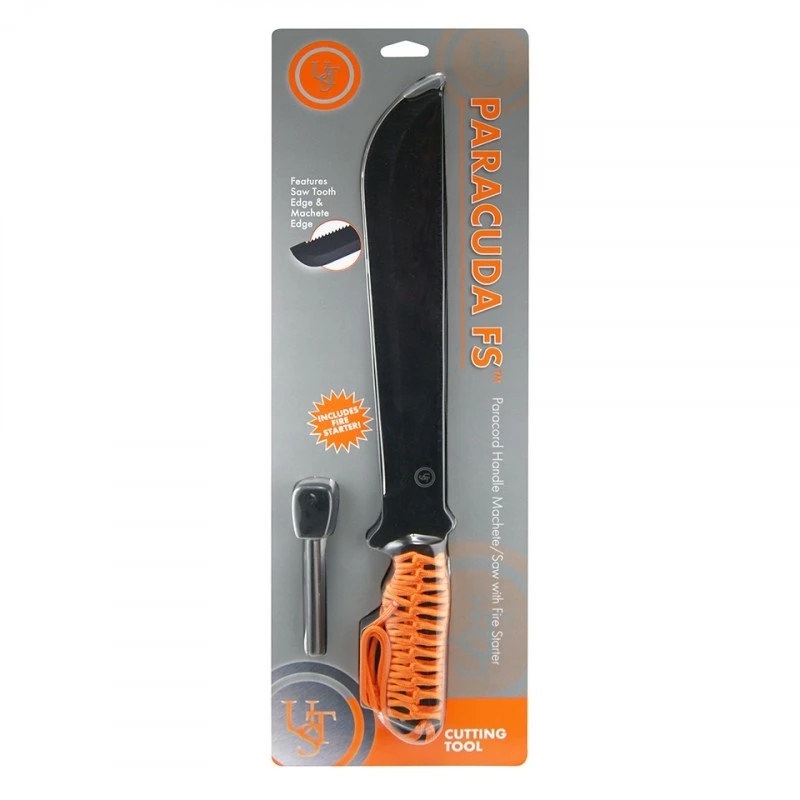 Robuste et flexible, cette machette ParaCuda FS de UST contient une lame revêtu d’oxyde noir comprenant d’un côté une lame lisse et de l’autre une scie. La poignée est enveloppée de paracorde orange pour une prise en main sûre et peut être déroulée (2.7 mètres) en cas de besoin.