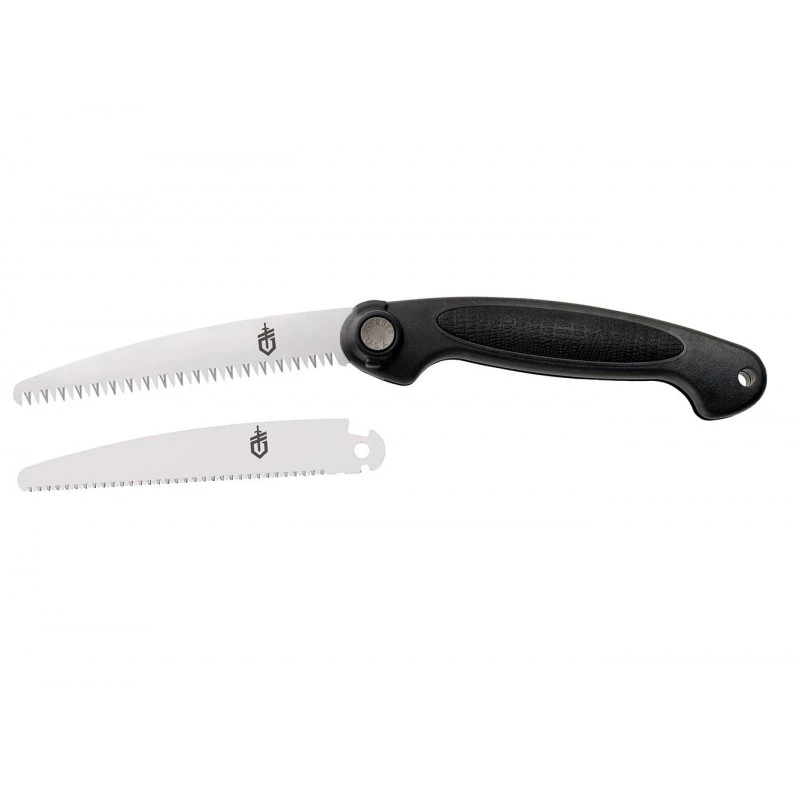Cette scie Gerber Exchange-A-Blade Sport est livré avec une lame de scie à dents grossière et une lame à dents fines. Le manche est en nylon renforcé de fibre de verre noir avec inserts Kraton et trou pour un cordon.