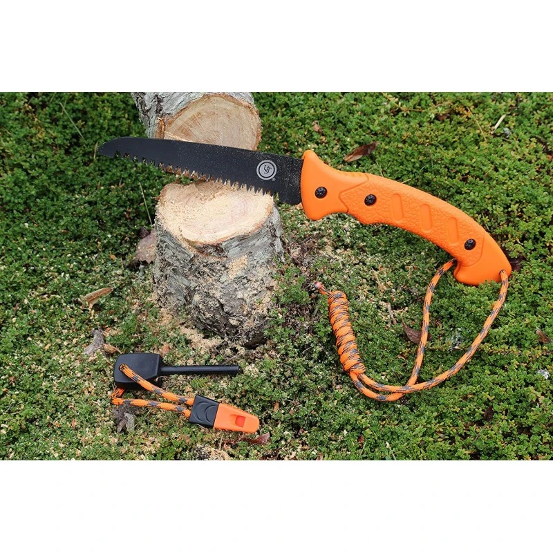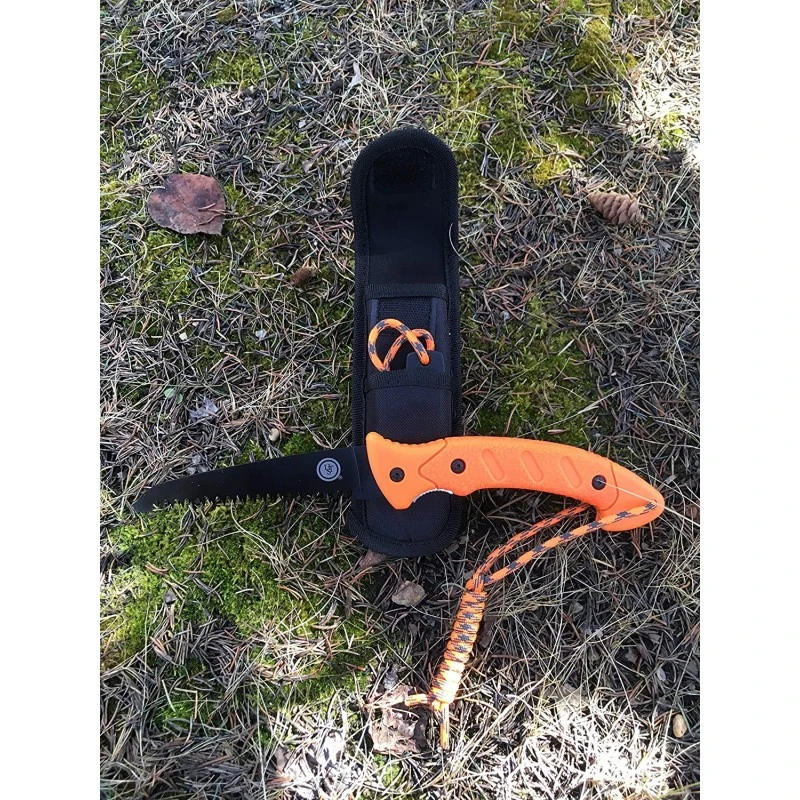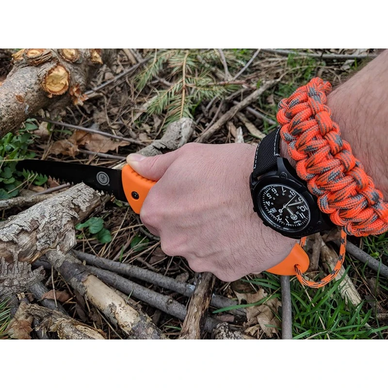 Idéale pour la randonnée ou le camping, la Scie Pliante Para Pro UST offre une lame de 14cm en acier inoxydable recouverte d’oxyde noir et un manche TPR de couleur orange.
