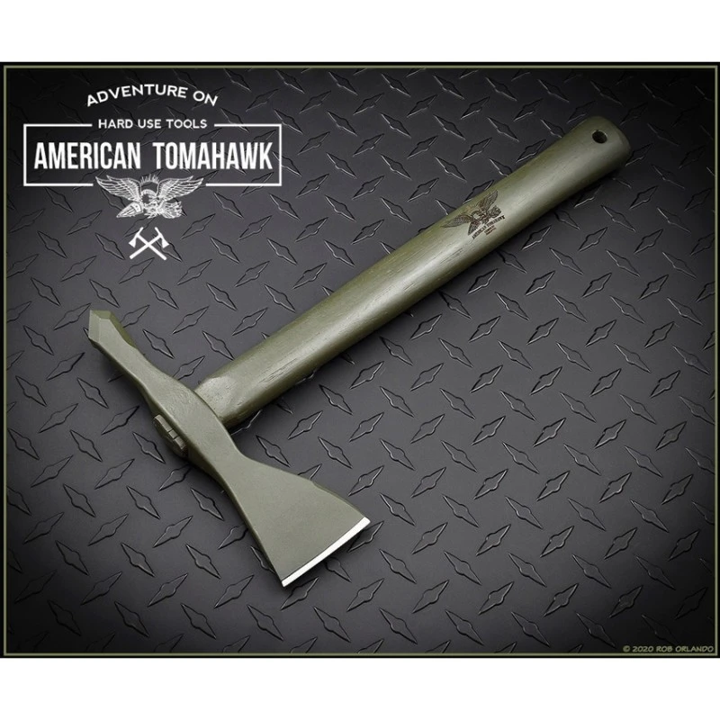 La hache Tomahawk Model 1 d’American Tomahawk dispose d’un manche en Hickory vert avec trou pour lanière et d’une tête en acier 1060HC de 20 cm à revêtement en poudre verte. Sa tête possède une lame de 6 cm et une pointe agressive de 7,6 cm.